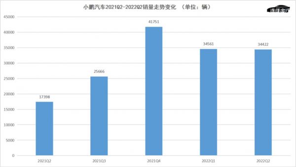 小鹏汽车2021Q2-2022Q2销量走势变化,数据来源于财报,连线出行制图