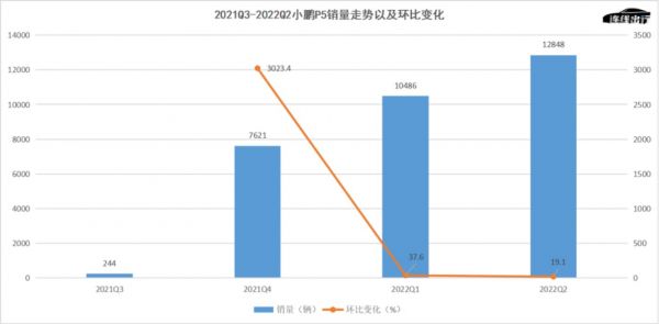 2021Q3-2022Q2小鹏P5销量走势以及环比变化,数据来源于公开数据,连线出行制图