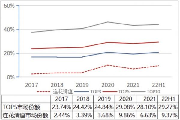 (连花清瘟在零售药店端市场份额,来源:中报)