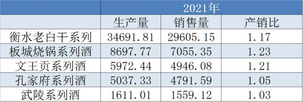 为了让武陵酒更强势,公司选择扩充产能,据悉,公司于2020年对武陵酒进行扩建,一期1500吨的基酒产能已于2021年9月投料生产,二期2000多吨的基酒产能也正在扩建之中,二期建成后,武陵酒的基酒产能达4000吨以上。从产量来看,公司2021年老白干酒产量达到34691.81千升,而武陵酒在5大酒品中最少仅有1611.01千升,在产销比接近1:1的情况下,提产对扩大营收有直接效果。