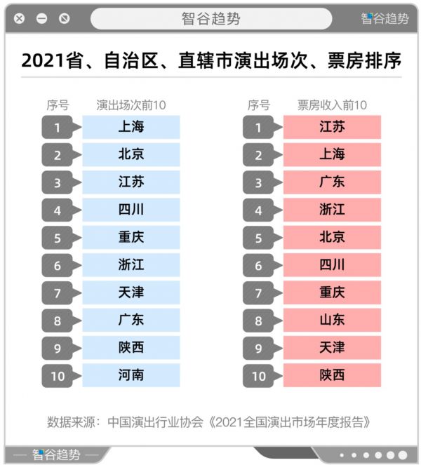 其中,演出场次排名前五的省份是上海、北京、江苏、四川和重庆;票房收入前五的是江苏、上海、广东、浙江和北京。