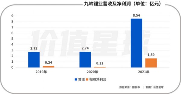 2021年,九岭锂业营收为8.54 亿元,赣锋锂业和天齐锂业的总营收已分别达到111.6亿和76.63亿。