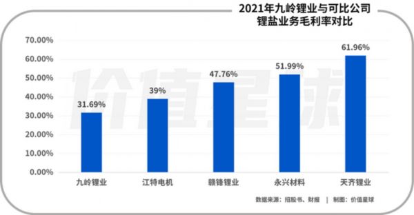 从锂盐毛利率来看,2021年度,碳酸锂等原料价格的飞涨让全行业从中受益。2021年,天齐锂业的毛利率为61.96%、赣锋锂业为47.76%,九岭锂业只有31.69%,并不具备明显优势。