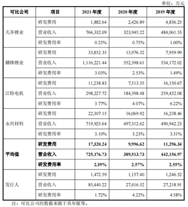 就算是单和同业公司相比,九岭锂业也落伍了。招股书显示,2021年行业内公司的研发费用率平均值为2.39%,而九岭锂业的研发费用率只有1.72%。