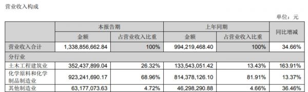 目前,三维化学已经形成了三大业务板块:工程、化工、催化剂,近年转型下化工已成为中流砥柱。半年报显示,化工业务占比三维化学总营收近7成,其中醇醛酯类产品贡献收入6.98亿元,同比增长25.96%,残液加工类产品实现收入2,18亿元,自去年起成为公司的前两大收入来源。