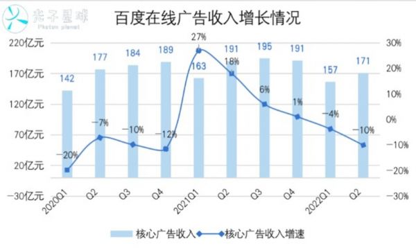 第二季度,百度在线广告收入为171亿元,同比下滑10%,在百度核心收入中的占比为74%,相比去年同期的79%有所降低。