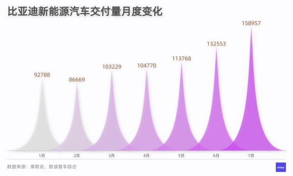 根据乘联会的数据,1-7月,比亚迪的销量一直是第一,除了2月,环比一直在增长。7个月共交付79万台新能源汽车,同比大增301%。