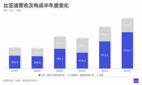 上半年,比亚迪营收约1506.1亿元,同比增长65.7%。最引人注目的肯定是汽车相关业务,这项业务营收首次突破千亿,1092.7亿的营收同比增长了130%。这样的规模还有这样的增长,对比新势力本季度增速纷纷环比下滑,比亚迪的业绩简直炸裂。