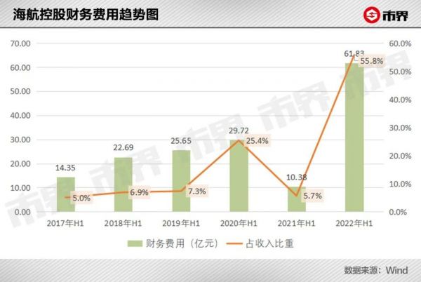 具体来说,期内海航控股光是毛利就亏了56.33亿元,此外更大亏损还来自于61.83亿元的巨额财务费用——在收入同比下滑35%的情况下,财务费用增长了495.66%,占收入比重高达55.8%。