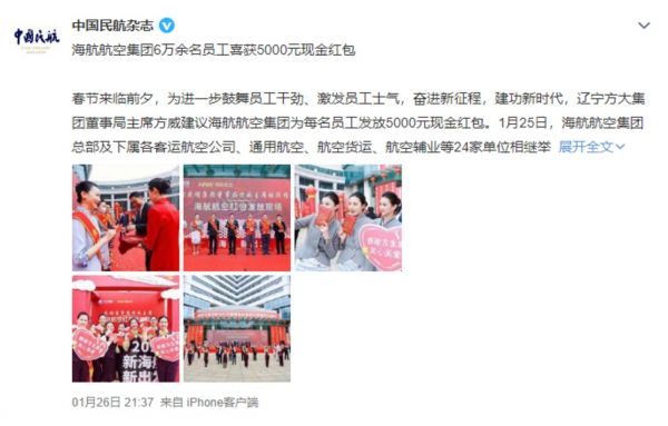 2022年1月25日,即海航正式易主方大后不久,海航控股旗下金鹏航空上海基地就堆起了一面“现金墙”,同一天海航航空集团总部及下属各航司24家单位相继举行了类似的红包发放仪式。