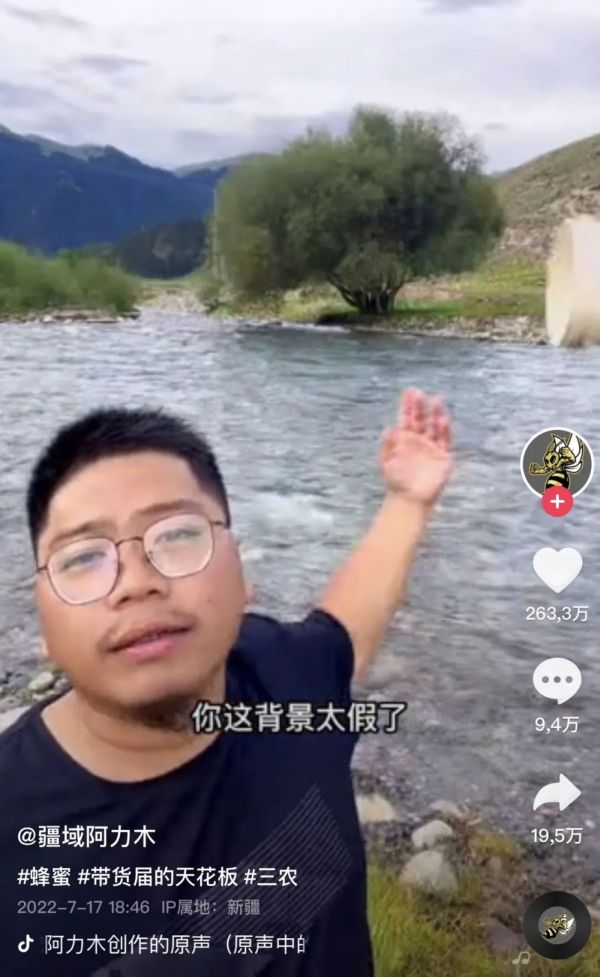 无独有偶,不久前,另一位抖音达人“疆域阿力木”也曾因“你这背景太假了”而红极一时。原因是疆域阿力木直播中身后的环境太过自然清澈,而阿力木本人的长相则与其背后的环境过于违和。