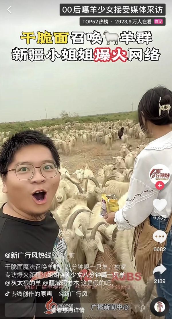 在抖音,因“梗”爆火并不少见。但“灰太狼的羊”的视频却有着与众不同的气质,她身处新疆巴音郭楞,视频中随处可见的是边疆地貌和城市中绝不会见到的成群牛羊。这种自然到极致的环境,与她网红的身份形成的明显的区隔,也成了她爆红的助推力量。