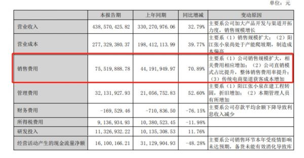 通过翻阅财报,可以窥得这家“百年老字号”增收不增利的另一原因是销售费用大幅增加。 财务数据显示,今年上半年张小泉在销售费用上的支出近7552万元,同比增长70.89%。对于销售费用增加的原因,张小泉提到主要系公司销售规模扩大,相关费用相应增加;公司直销模式占比提升,整体销售费用率提升;传统电商渠道获客成本增加。
