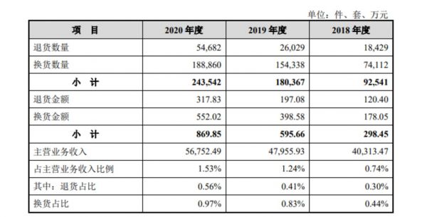 另一方面,张小泉的退换货比例持续走高。招股书显示,2018年-2020年,张小泉退换货数量为9.25万件、18.04万件、24.35万件;对应的退换货金额分别为298.45万元、595.66万元及869.85万元,占主营业务收入的比例分别为0.74%、1.24%及1.53%,其中因质量原因的退换货金额分别为127.48万元、243.88万元、381.69万元,占主营业务收入比例分别为0.32%、0.51%和0.67%。