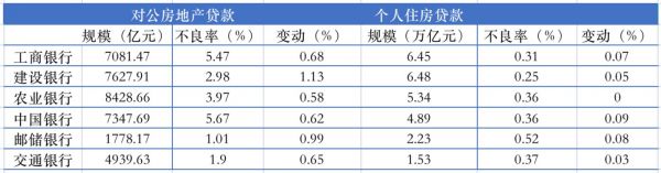 个人住房贷款方面,不良率虽然绝对值较低,但除农行没有变化外,其他五家银行的个人住房贷款不良率与去年末相比集体抬升。