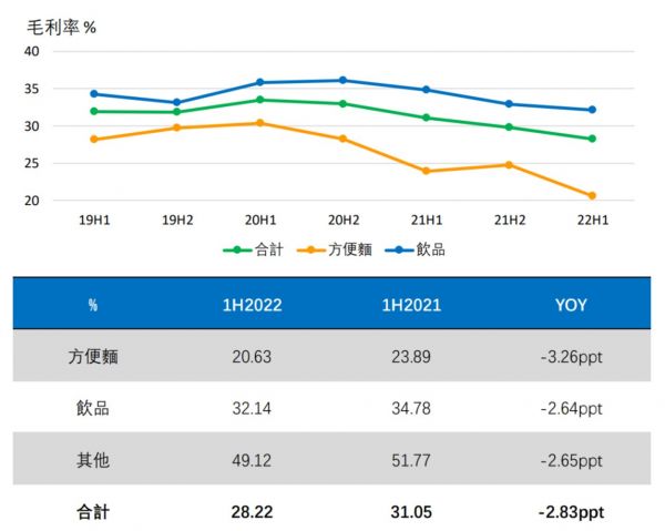 2022年上半年,盈利情况没有好转,两大业务的毛利率仍在加速下滑。其中,方便面业务的毛利率同比下降3.26个百分点至20.63%,导致方便面业务2022年上半年的股东应占溢利同比下降39.23%至5.44亿元;饮品毛利率同比下降2.64个百分点至32.14%,导致饮品业务2022年上半股东的应占溢利同比重挫37.06%至7.44亿元。