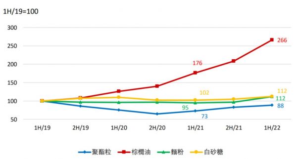 康师傅在财报中将业务毛利率下滑的原因归结为原材料价格上涨。据公司披露的路演文件可知,棕榈油是主要影响因素,2022年上半年价格同比上涨51.14%。