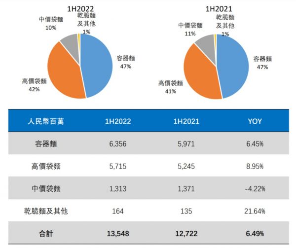 但是效果并不理想。2022年上半年高价袋面的占比为42%,与2021年同期的41%几乎没有变化,销售额也仅仅增长了8.95%,而销量增长最多的却是低价位的干脆面,增幅达21.64%。