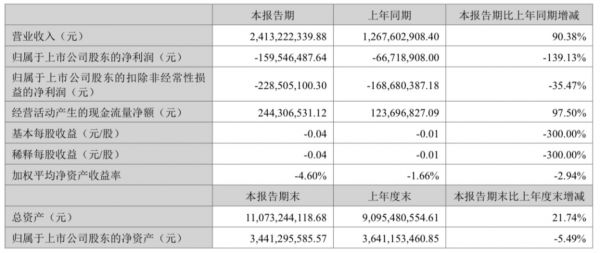 财报显示,公司实现营业总收入24.13亿元,同比增长90.38%;归母净利润亏损1.60亿元,上年同期亏损6671.89万元;扣非净利润亏损2.29亿元,上年同期亏损1.69亿元,亏损进一步扩大。