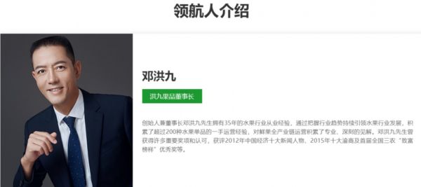 20世纪90年代,家境贫寒的邓洪九早早就加入了重庆“棒棒”大军。一次偶然机会,邓洪九发现了老家水果与重庆市区的差价,于是做起水果批发生意。一做就是20年,邓洪九联手妻子,把洪九果品从一家小小的批发商做成中国最大的自有品牌鲜果分销商,年入100亿。