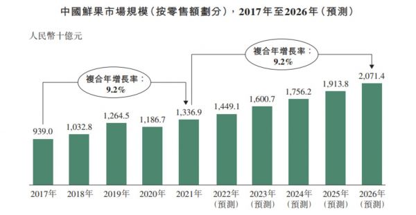 中国是世界上最大的水果消费国。数据显示,我国鲜果零售市场规模于2021年已增至1.34万亿元,随着消费升级及市场进一步整合优化,未来5年预计市场仍将以9.2%的复合年增速继续扩大,2026年将达到2万亿规模。
