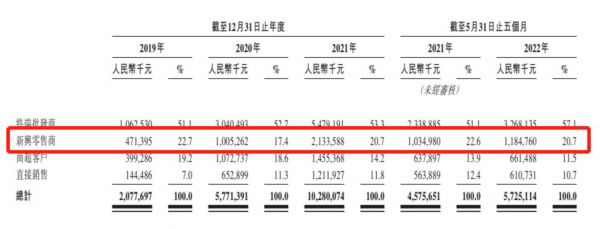 此外,还得益于增长迅速的新零售渠道。2021年,洪九果品新兴零售渠道营收为21.33亿元,在2019年这一数字还是4.71亿元,复合年增长率达112.81%。这一渠道又细分为社团团购、社区生鲜连锁店、即时电商、以及综合电商四大方向,其中,由于疫情影响,社区团购从2019年27.1万的营收一跃到2021年5.44亿营收,两年时间内涨幅超过2000倍。