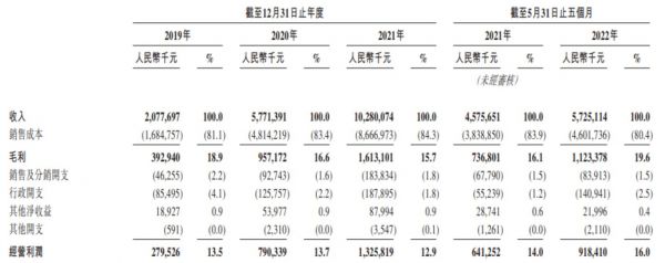 不过,就其毛利来看并不算高。2019年至2021年以及2022年截至5月31日,洪九果品的毛利分别为3.93亿元、9.57亿元、16.13亿元、11.23亿元;毛利率分别为18.9%、16.6%、15.7%、19.6%。毛利率连续3年持续下降,直到今年5月才迎来了转折。