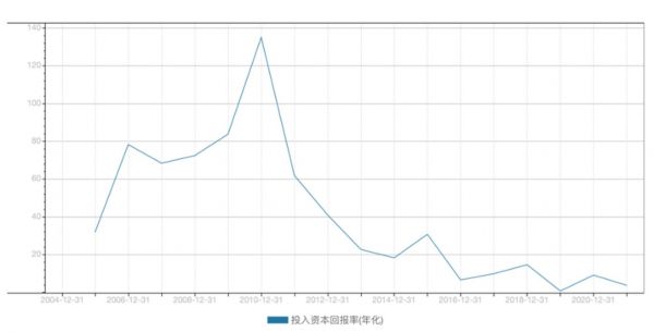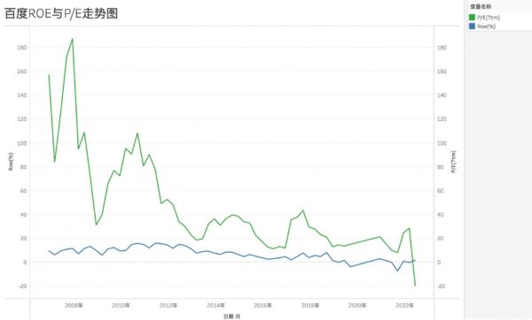 我们就整理了上市至今百度的P/E(市盈率)与roe的走势关系,见下图