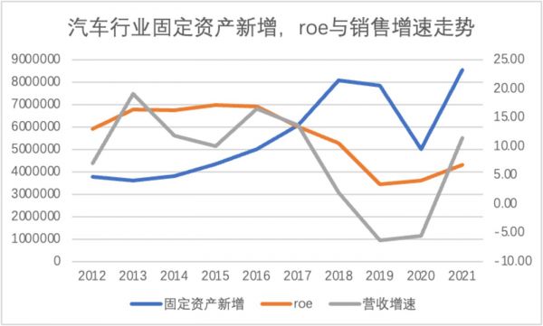 在过去十年,中国汽车行业其实经历了一个景气度的由强到弱再到强的景气度周期,在上图中可以比较清楚看到,roe和营收增速可谓是行业的前置指标,在两大指标触顶后两年,固定资产新增触顶,行业于是进入剧烈下行阶段:产能现峰值,营收和roe双杀。