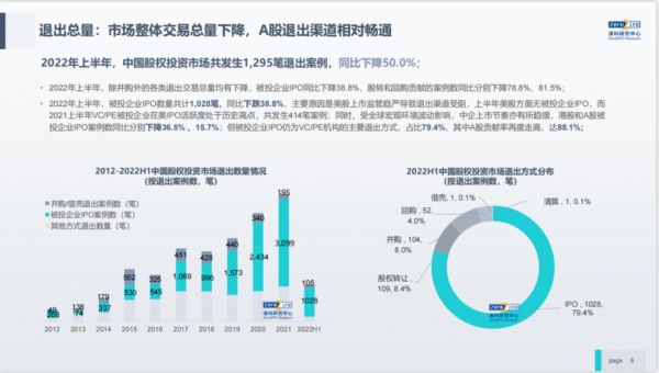 清科研究中心数据显示,2022年上半年,中国股权投资市场共发生1295笔退出案例,整体退出情况在下降,幅度达50%。其中,被投企业IPO仍为VC/PE最主要的退出方式,比例占到了近80%。