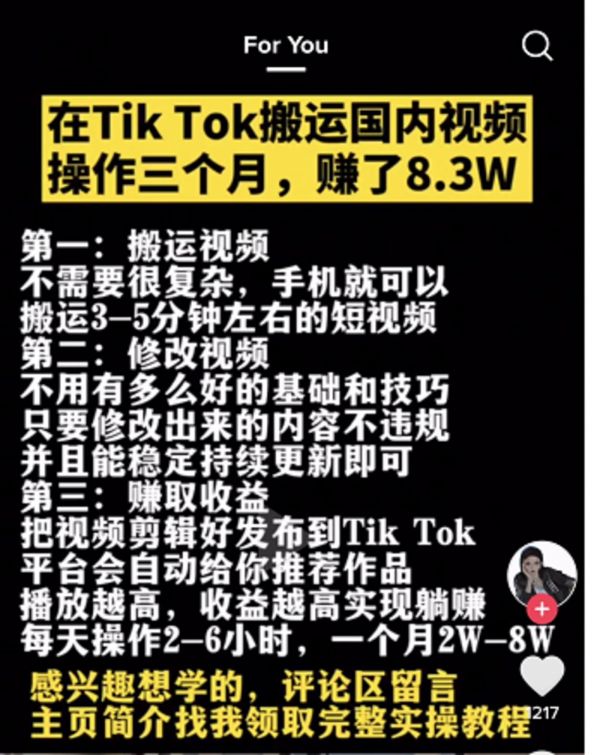 搬运也有小技巧,一个在TikTok上分享搬运经验的账号透露,最好搬运不露脸的、少有中文描述的、语音也不宜多的内容,或者就直接搬运爆款视频。