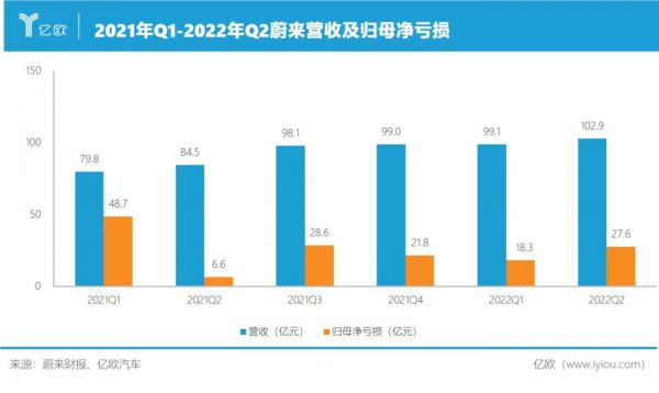蔚来2022年第二季度实现营收102.9亿元,同比增长21.8%,单季度收入首次突破百亿大关,其中车辆销售收入为95.7亿元,同比增长20.1%,占总收入的93%。