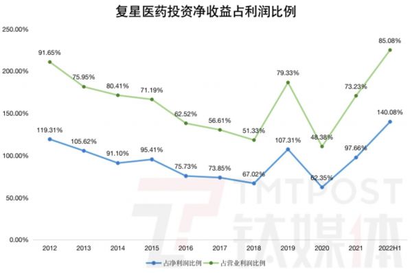 2022年上半年,复星医药投资净收益达21.67亿元,占净利润及营业利润的比例分别高达140.08%、85.08%。其中,权益法核算的长期股权投资产生的收益位7.99亿元,处置交易性金融资产取得的投资收益为7.53亿元,包括转让子公司黄河药业、上海输血股权,及出售BioNTech(BNTX.US)公司部分股票。