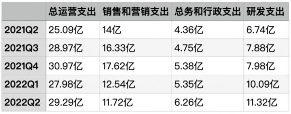 这一部分体现在经营开支上。财报显示,B站该季度经营开支总额为29.29亿元,较去年同期的25.09亿元增长17%。而组成经营开支的三部分——销售及营销开支、一般及行政开支和研发开支中,除了销售及营销开支,另外两项连续四个季度都在增加。