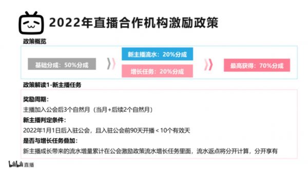 从政策来看,B站在直播方面也的确给出了比其他多数平台更大力度的分成优惠。今年年初B站发布了《2022年哔哩哔哩直播公会激励政策》,其中写道2022年1月1日后入驻的新主播,入会后3个月的基础分成是50%,加上奖励,最高可获得3个月70%的分成。而在一般直播平台,这个数字只有50%甚至更低”。