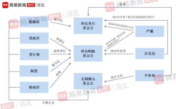 西安善行基金会的监事尹欢欢,同时也是无锡横山基金会的项目专员;另外,西安蚂蚁基金会理事长钱旭星、副理事长贺行林、秘书长杨慧、理事蔡雨洋,以及西安善行基金会秘书长董敏花等人,均曾出现在无锡横山基金会早期的人员名单中……
