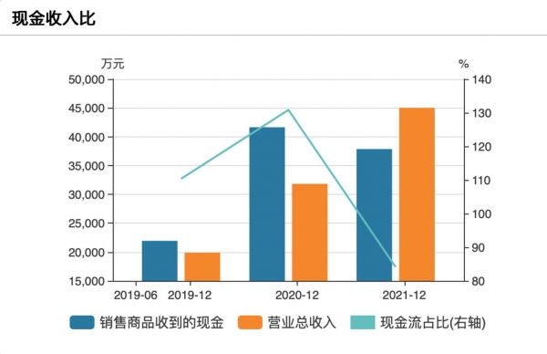 同时公司回款效率越来越低,2019年-2021年应收账款周转率分别为11.33次、7.79次和5.00次。从现金收入比可见,2021年由于应收账款占比较大,导致销售商品收到的现金仅占营收的84.22%。2020年虽然收到现金远高于营收,但若去除1.90亿元的新增合同负债,现金收入比仅为71.07%,且当年的经营性现金流将为负。