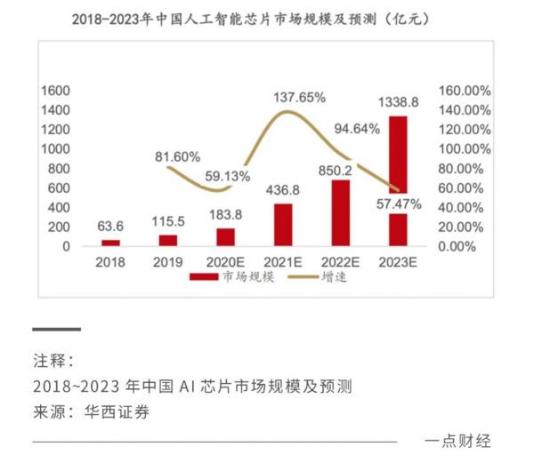 在国内,AI芯片市场需求旺盛,规模非常庞大。华西证券预测,到2023年,中国AI芯片市场将同比增长57.47%到1338.8亿元。