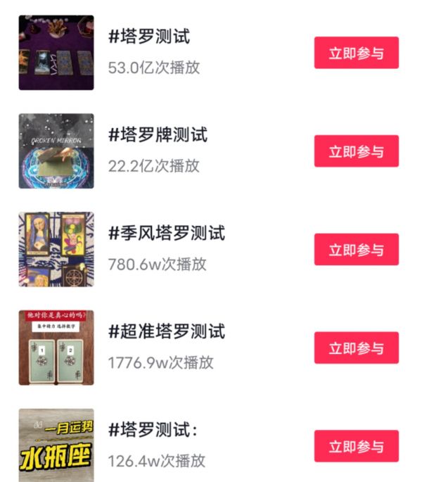 这些内容,在算法随机推送的机制加持下,曾经狂热地催促过无数人在短短几分钟的占卜中,找到决定人生方向的答案。短视频内关于#塔罗测试# #塔罗牌测试# 的话题热度一度居高不下,播放量均高达几十亿次。