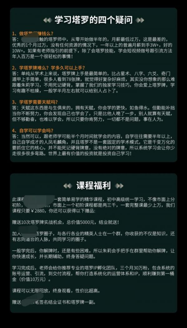 但这并非这套课程的全部,其“附赠”的内容才是关键。在所有小娱咨询的课程中,无一例外地都有专门的一节课讲述如何打造短视频塔罗IP,运营塔罗占卜类短视频账号。而在这些课程所附赠的资源中,也包括“推荐专业的塔罗IP孵化团队,三个月30万粉,包含系统的账号运营、引流到交付流程。”