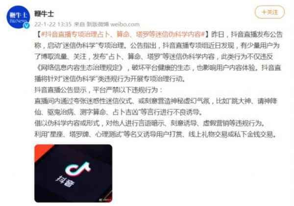 今年年初,抖音直播发布公告,启动了“迷信伪科学”专项治理计划。