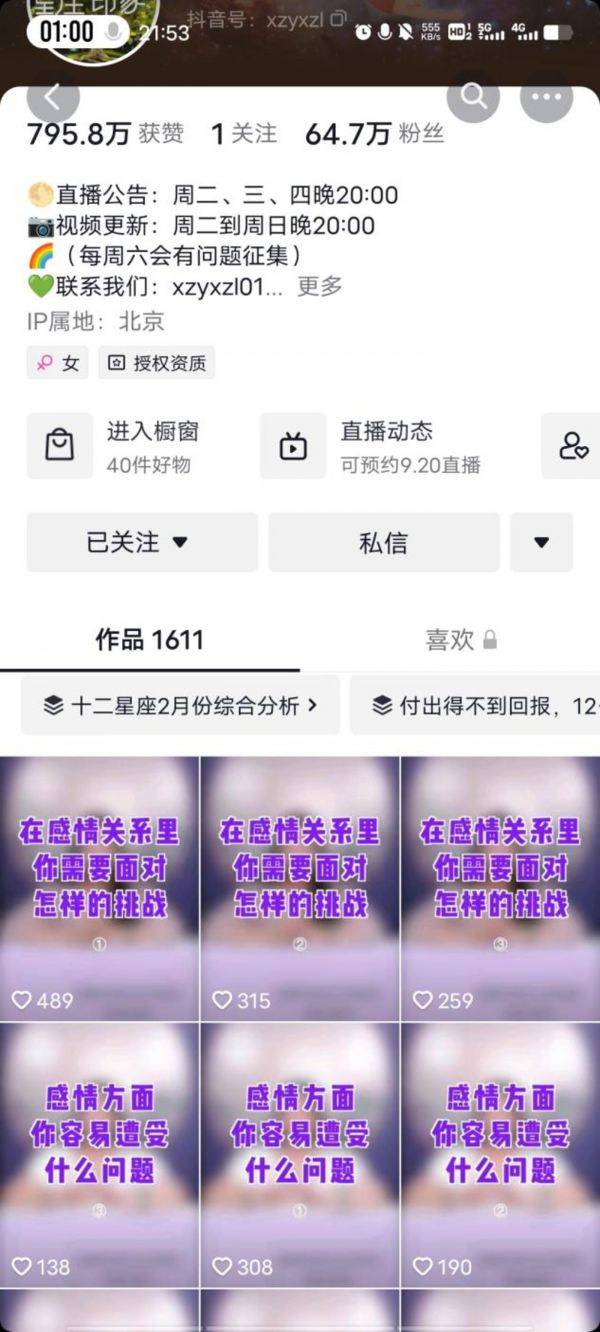 除了转行外,很多博主也开始转战“情感咨询”。过去为了吸引用户,塔罗师们往往会在账号中增加“塔罗”“神准”“预测”等关键词,但如今,吸引受众的噱头,已经变成了“他还爱我吗”“他想我吗”等情感类问题。