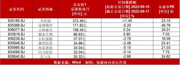 上周(9月12日-9月16日)市场行情方面,北交所市值前十的企业,有七家股价出现下跌,其中“市值一哥”贝瑞特“(835185.BJ)跌幅最高达11.5%,连城数控(835368.BJ)下跌5.20%,吉林碳谷(836077.BJ)上涨0.33%,颖泰生物(833819.BJ)上涨0.90%,长虹能源(836239.BJ)下跌3.8%,森萱医药(830946.BJ)下跌2.48%,海泰新能(835985.BJ)下跌5.15%,同力股份(834599.BJ)下跌0.14%,富士达(835640.BJ)下跌2.66%,诺思兰德(430047.BJ)上涨0.28%。