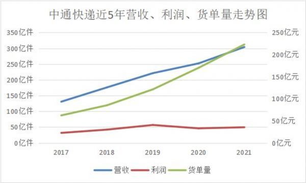 从中通快递近5年(2017-2021)财报数据来看,营收分别为130.6亿元、176.04亿元、221.10亿元、252.14亿元、304.05亿元;;货单总件量分别为62.2亿件、85.2亿件、121.2亿件、170亿件、223亿件;利润分别为31.58亿元、42.01亿元、56.71亿元、46亿元、49.5亿元。