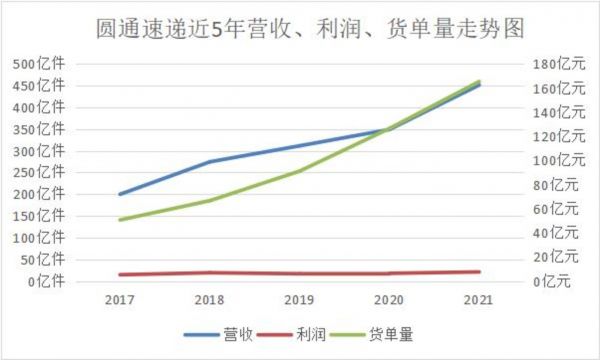 圆通速递近5年(2017-2021)财报显示,其营收分别为199.82亿元、274.65亿元、311.51亿元、349.07亿元、451.55亿元;货单量为50.64亿件、66.64亿件、91.15亿件、126.48亿件、165.43亿件;净利润为14.43亿元、19.04亿元、16.7亿元、17.7亿元、20.92亿元。