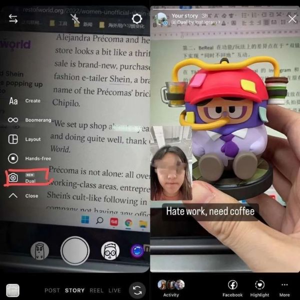 Instagram 的类 BeReal 功能名叫“Dual”,被放在了发布 Story 的功能下,与“循环”、“拼图”等 Story 模板并列。使用“Dual”后,后置摄像头拍下的图片是主背景,前置摄像头拍下的图片类似于“贴纸”可以在背景中被移动、缩放和调整角度。看上去 Instagram 中的“Dual”功能更像是新增的一个摄像头模板。