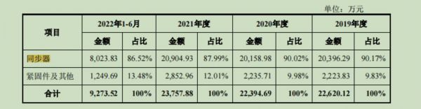 报告期内,同步器构成公司主营业务收入的主要来源。数据显示,2019年-2021年以及2022年1-6月,迅达工业的同步器销售收入为20396.29万元、20158.98万元、20904.93万元以及8023.83万元,占主营业务收入的比例分别为90.17%、90.02%、87.99%和86.52%。同期紧固件及其他收入占主营业务收入比例分别为9.83%、9.98%、12.01%和13.48%,尽管该部分业务收入占比提升,但无法与同步器匹敌。