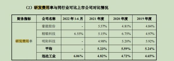与同行业比,迅达工业的研发费用率也稍逊一筹。报告期内迅达工业的研发费用率分别为4.65%、4.72%、4.82%以及6.06%。2019年-2021年,行业可比公司的均值水平分别为5.24%、5.59%、5.23%。具体来看,2019年-2021年,豪能股份的研发费用率为4.84%、4.81%、5.57%;精锻科技的研发费用率为4.97%、6.75%、5.15%;明阳科技这一指标为5.92%、5.2%、4.98%。