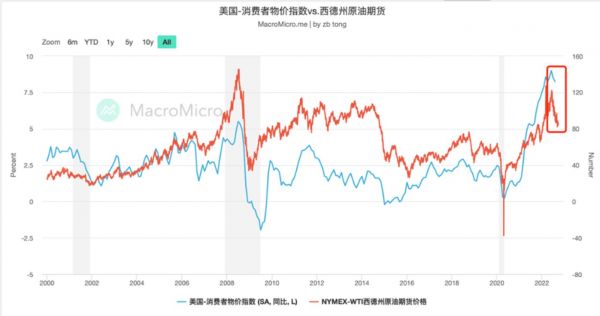 回答此问题,表面上原因可能有6月美指连番下挫有超跌嫌疑,8月美联储没有议息会议,加息步伐暂停给市场喘息机会等等,这些也都是合理的,不过究其根本乃是市场开始蔓延通胀触顶的言论,换言之,如果通胀能够持续得到控制,加息预期减弱,市场企稳的预期也就随之加强。