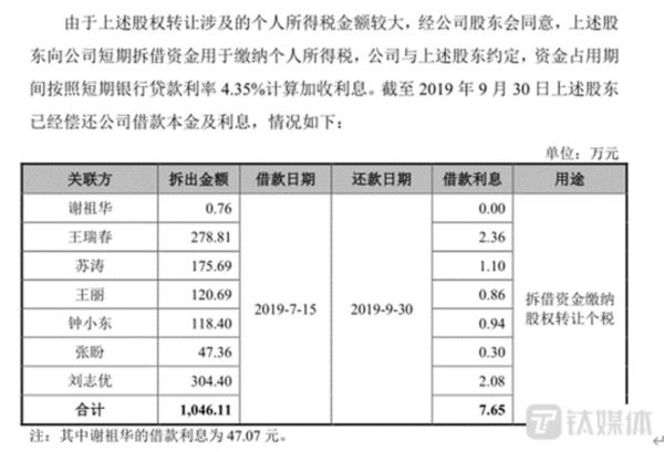 也就是说,上述股权转让涉及1000多万元的个人所得税,而这部分资金由上述股权转让方向民爆光电短期拆借所缴纳,并于之后偿还给了民爆光电,形成了两个月多的资金占用。